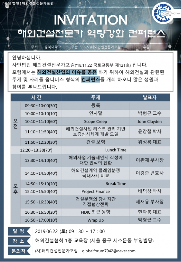 해외건설전문가 역량강화 컨퍼런스 페이지 정보 작성자 포럼관리자 댓글 0건 조회 302회 작성일 22-07-29 14:47 목록 답변 글쓰기 본문 해외건설전문가 역량강화 컨퍼런스 세미나 일정 안내 이전글제 49회 해외건설전문가포럼 22.07.29 다음글해외건설전문가포럼 창립기념 대토론회 22.07.29 댓글 0 댓글목록 등록된 댓글이 없습니다.