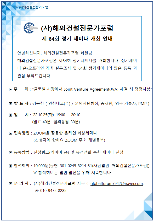 제 64회 해외건설전문가포럼 페이지 정보 작성자 최고관리자 댓글 0건 조회 239회 작성일 23-04-17 12:15 목록 답변 글쓰기 본문 제 64회 해외건설전문가포럼 이전글제 65회 해외건설전문가포럼 23.04.17 다음글제 63회 해외건설전문가포럼 23.04.17 댓글 0 댓글목록 등록된 댓글이 없습니다.