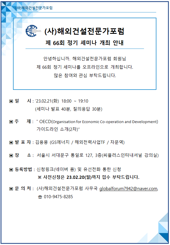 제 66회 해외건설전문가포럼 페이지 정보 작성자 최고관리자 댓글 0건 조회 277회 작성일 23-04-17 12:16 목록 답변 글쓰기 본문 제 66회 해외건설전문가포럼 이전글제 67회 해외건설전문가포럼 23.04.17 다음글제 65회 해외건설전문가포럼 23.04.17 댓글 0 댓글목록 등록된 댓글이 없습니다.